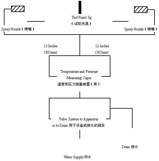 冲洗设备:冲洗设备如图所示,喷咀应是TG10型或相当的(在10PsiD压强下1加仑/每分钟,既在69Kpa时3.8L/每分钟)。工作水压为25±2.5PsiD(172±17Kpa),水温为70℉±5(21℃±3)。
